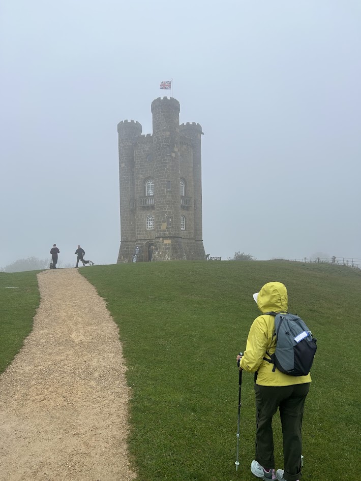 The rain and fog moved in today. We donned our rain gear and Court and I started out with a steep uphill climb from the town of Broadway to the top of a hill where Broadway Tower overlooks the landscape. Mom would join us at the cafe by the tower and hike with us the rest of the day to Chipping Campden.