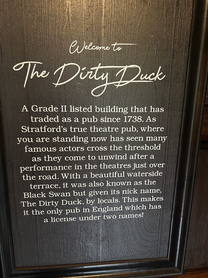 After the church, we went to eat lunch at the Black Swan Pub, which also is called The Dirty Duck by the locals. It’s a place where the Shakespearean actors in the town gather to imbibe and there’s a separate wing of the bar where they hang out. It was a cool vibe.