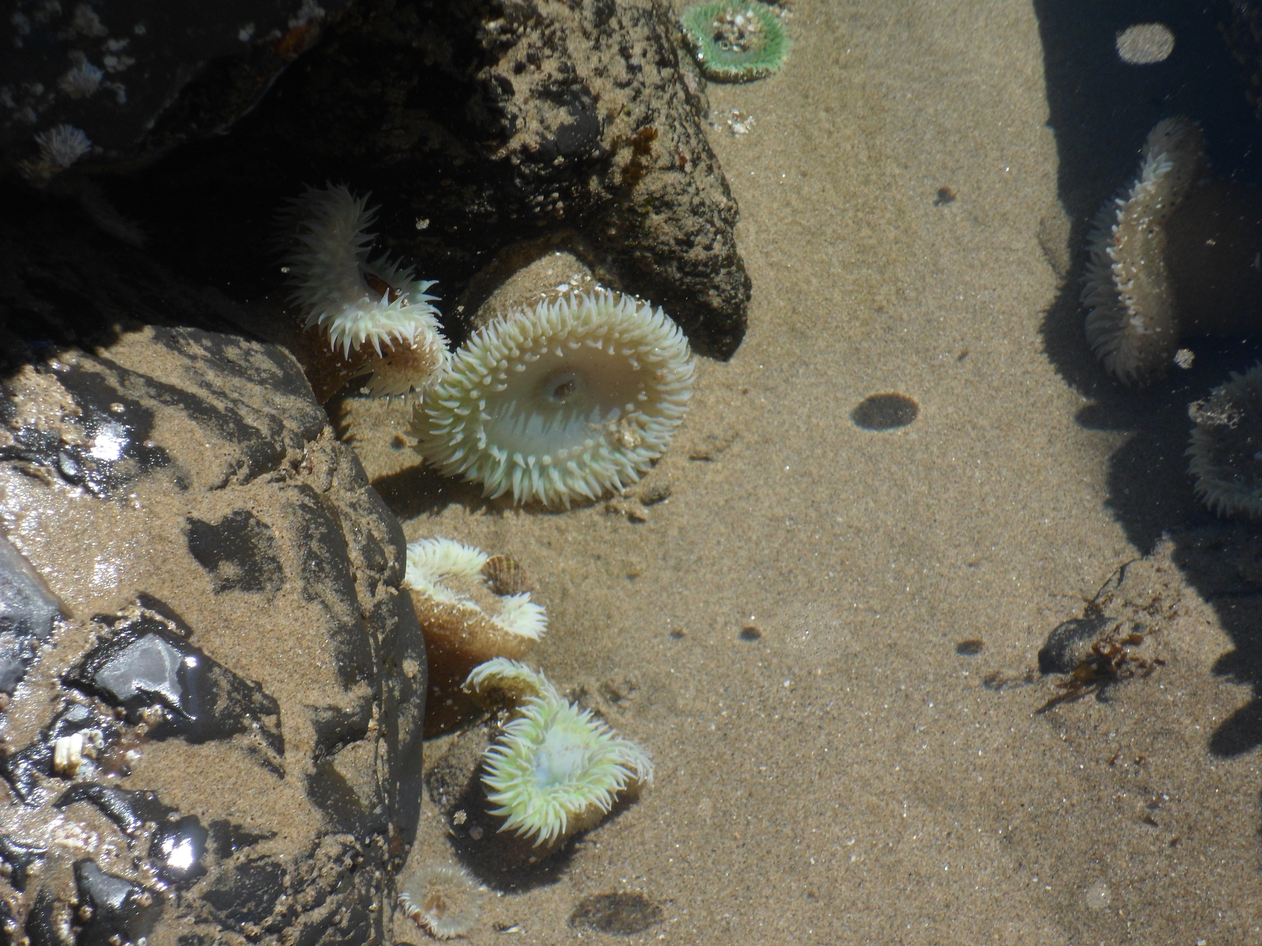 The beach was amazing, albeit somewhat crowded. There was a freshwater stream about 15 feet wide that came down from the forest and cut across the beach straight into the ocean. The sand was fine and gray. Around the rocks were many tide pools fed by the very cold water of the Pacific. Our feet were numb after a few minutes wading. In the tide pools were many creatures: purple and orange starfish as big as your hand, anemones (blue and green), urchins, mussels (Court was amazed at the size of some), and tons of barnacles, all clinging to the dark black rocks. The beach was very wide, probably 200 yards from water to the forest cliffs.