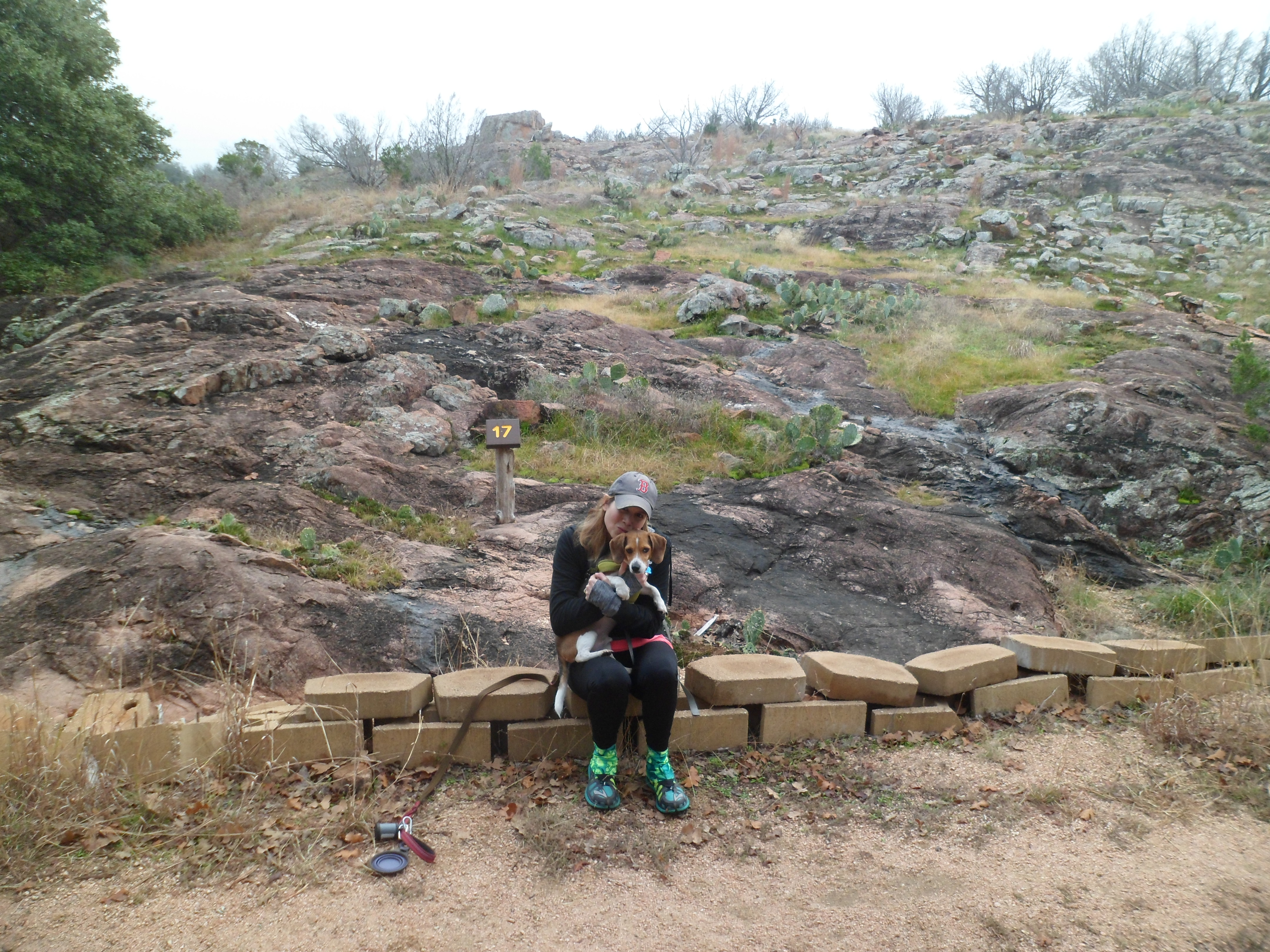 We made a loop of several trails in the park. It started out pretty flat through the primitive camping area (which I was unimpressed with) and then got a lot tougher when we got back toward the lake. Around this point, Biff started limping and favoring his left front paw. He hadn’t been on a hike of this length in a long time and we were worried that we pushed him too hard. We carried him for a about a mile and that mile ended up being the hardest part of the hike. To be fair, we probably would have carried him on most of this portion of the trail anyway, due to his back issues, but it was hard on both of us. Finally, we set him down for a rest and he “miraculously” was ok again. I think he just wanted to get a free ride for a while. 🙂