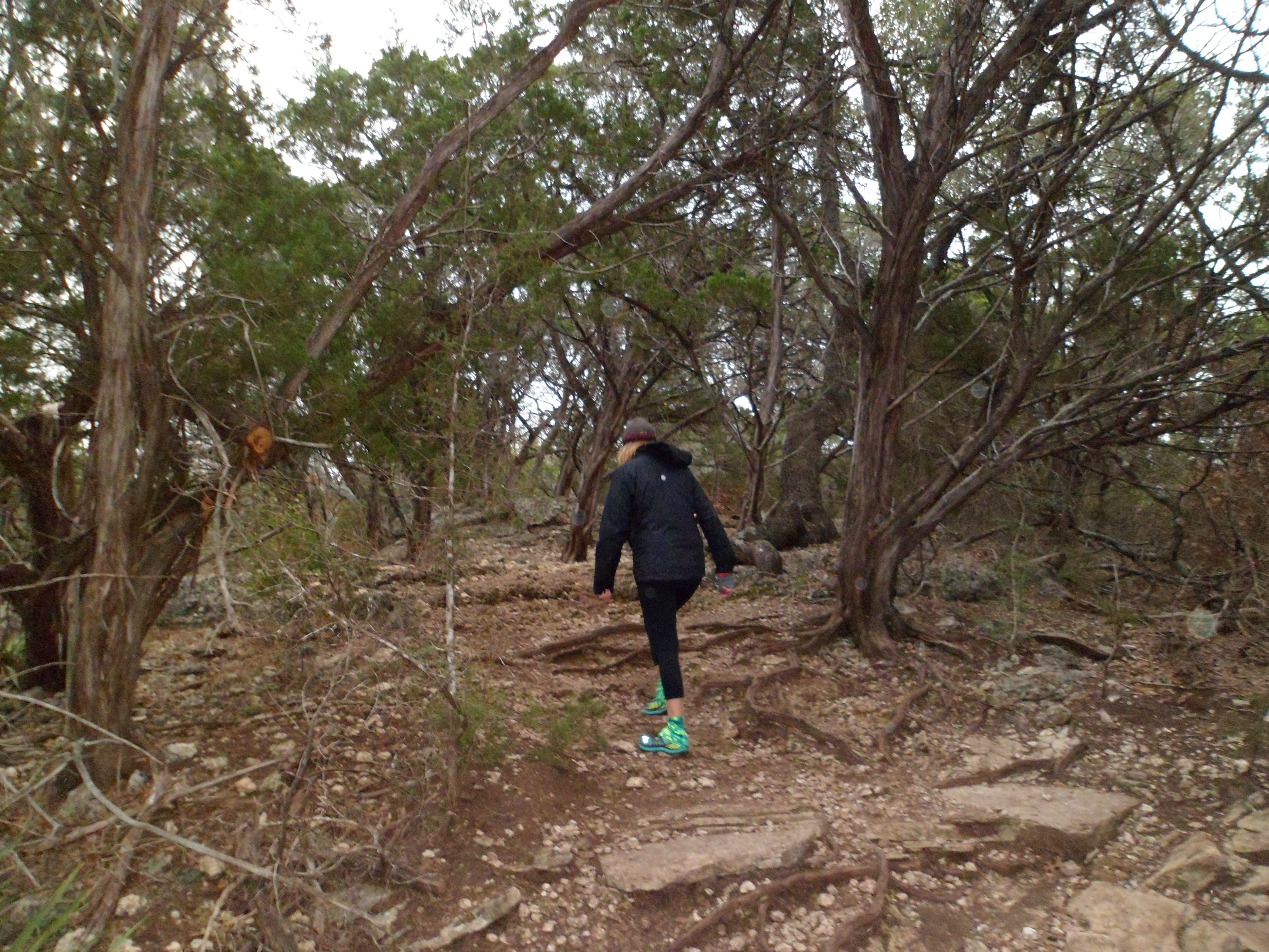 We went out to Emma Long Park this morning and did the quick loop of the Turkey Creek Trail. It was pretty chilly and rainy so the trail was not too crowded. We hit the trail a little after 8am and got done by 9:30. There were a few other hikers and the usual parade of dogs, but most of the time it felt like we had the trail to ourselves.