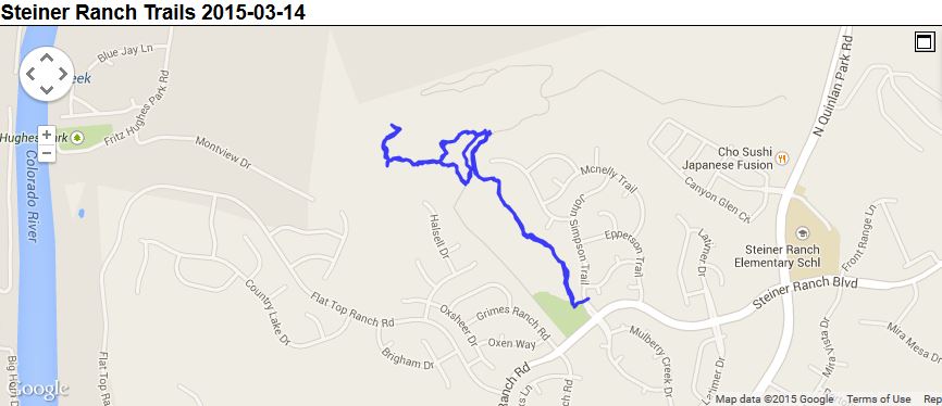We headed out to the Austin suburb of Steiner Ranch for a hike on the trail system that we have done multiple times before, back when Courtney’s parents had a house out there. The trail system is not very well marked and it is easy to get lost, as we have before, and as our track below shows. We had a basic pdf map on my phone, but that wasn’t super accurate either. Luckily it is not a very large trail system so there is no real danger of getting really really lost.