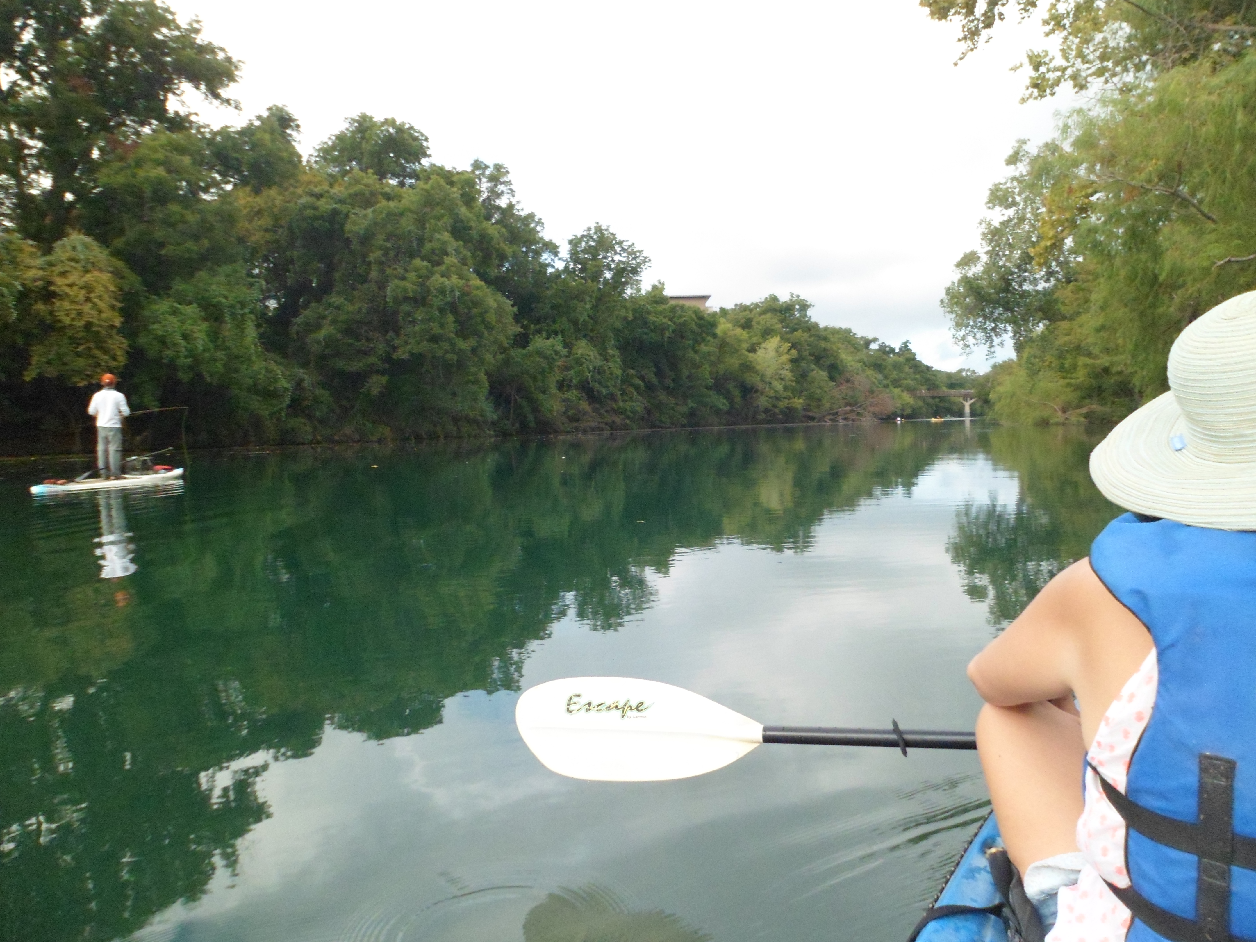It was a beautiful morning and there were very few people on the water with us, save a few other kayaks and fishermen. The weather was partly cloudy, which was nice because the sun was pretty harsh even though it was relatively early. Lots of turtles. We first paddled around to Lou Neff point near Barton Springs. The water around the point was really clear and we could see all the fish and turtles up close.