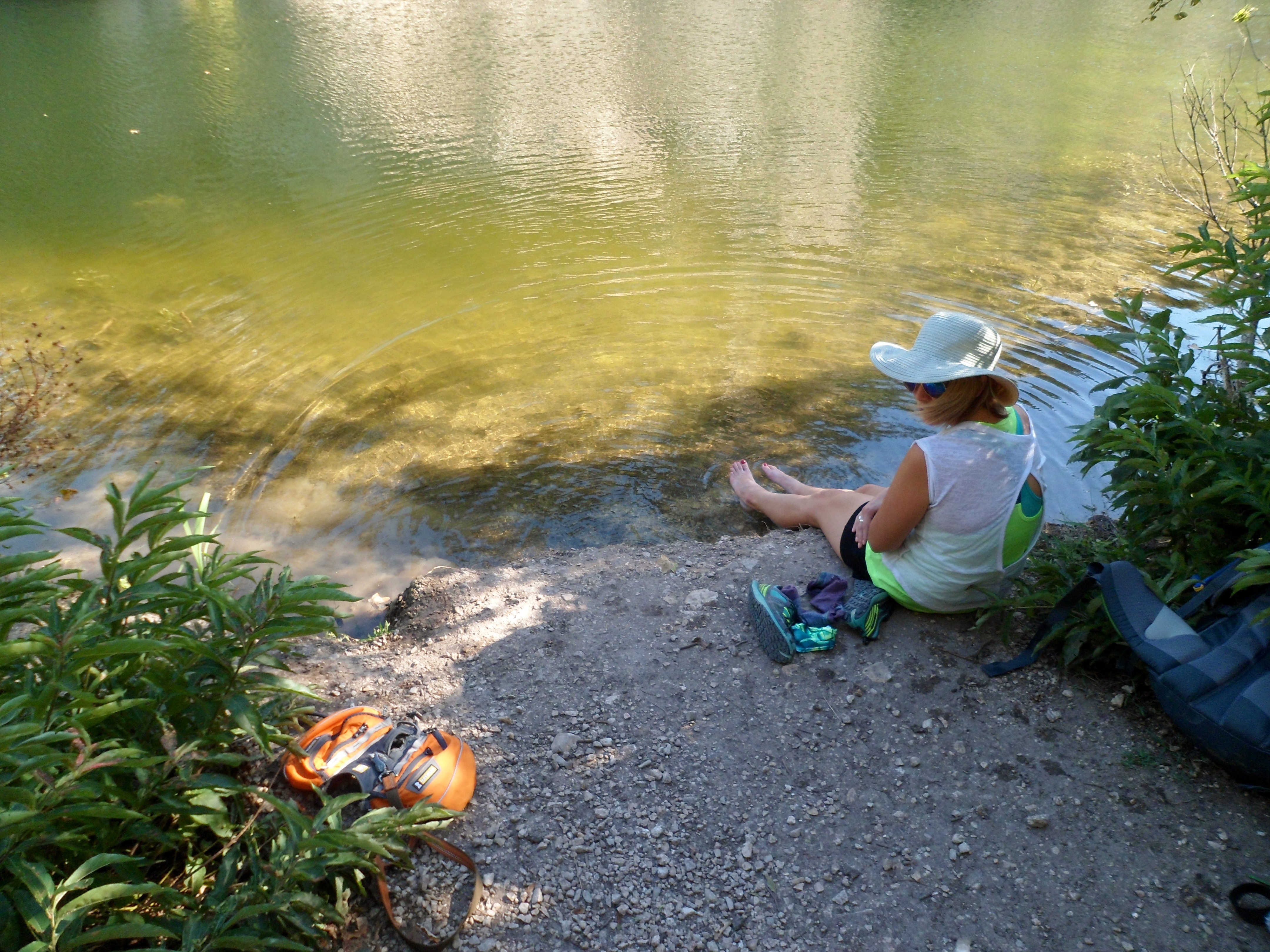 We walked along the plateau to a lookout point, but the sun was starting to beat down again and it was very exposed, so we continued on and took the difficult trail down, which was more of a vertical scree field than a trail. Finally at the bottom, we took another break at the primitive campsite next to the pond and filled up our bottles. The water was cold and felt great on our feet.