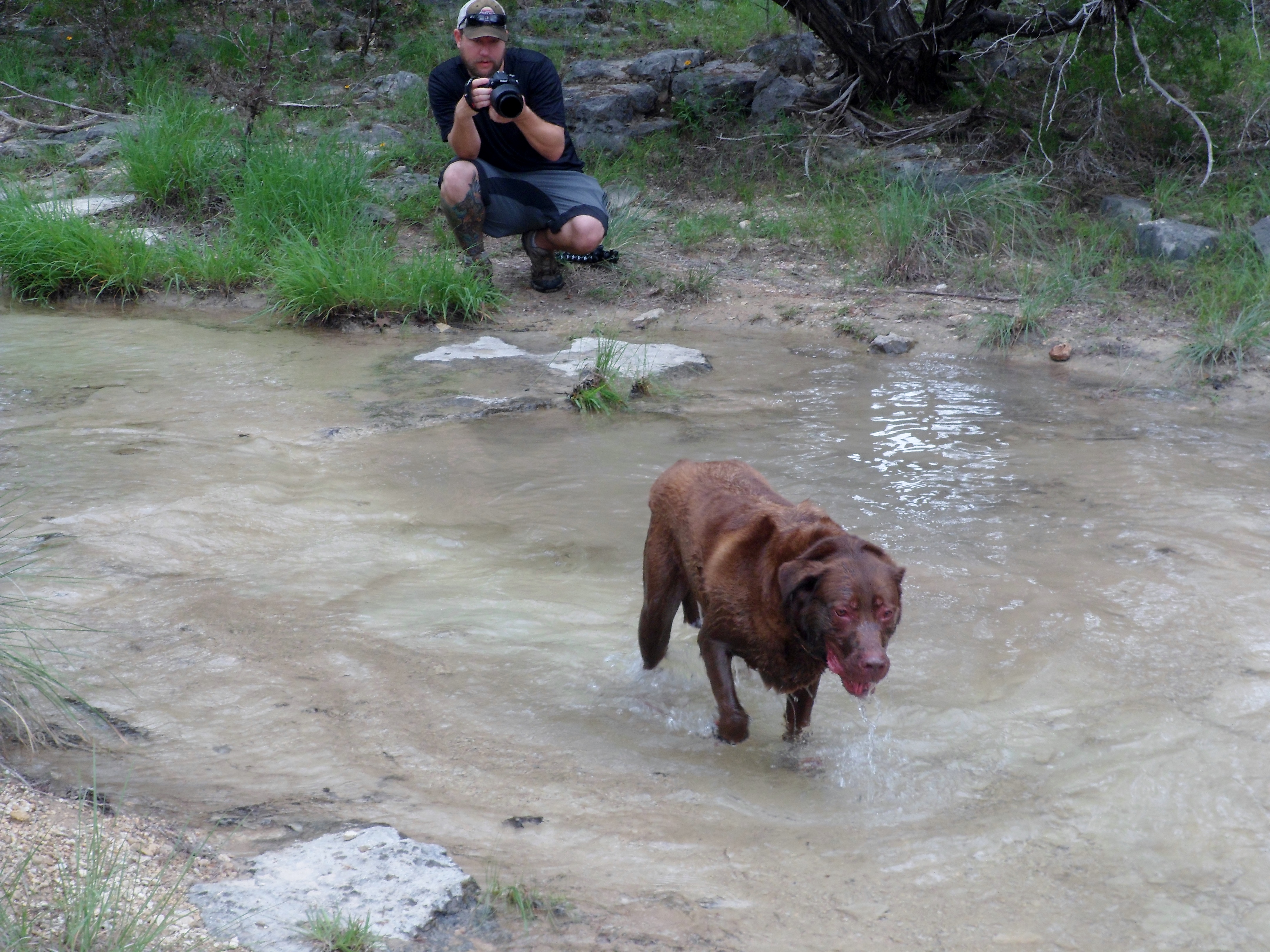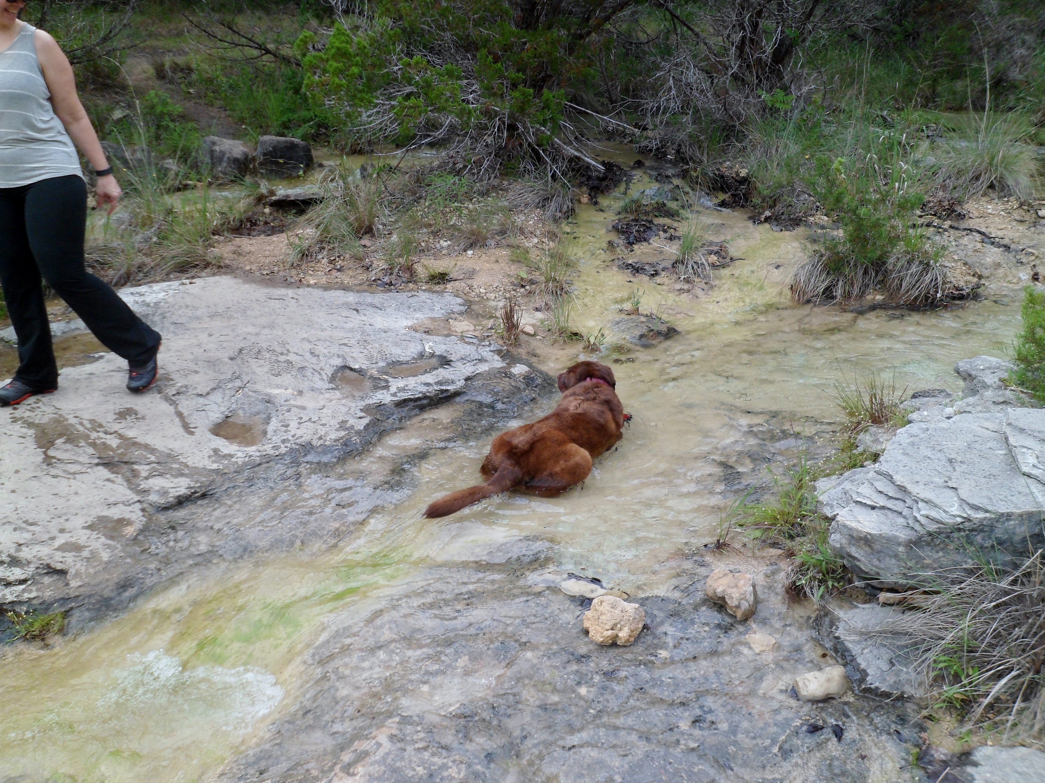 We got out to the trail about 9am and Sam took off with his doggie hiking shoes that are always a big point of conversation with other hikers we come upon. He has to wear them, at least at first, because he goes so hard that he rips the pads off his paws otherwise. The first creek we crossed was Bee Creek. We took a few photos and Sam took a bath. We were starting to feel the temperature rise already.
