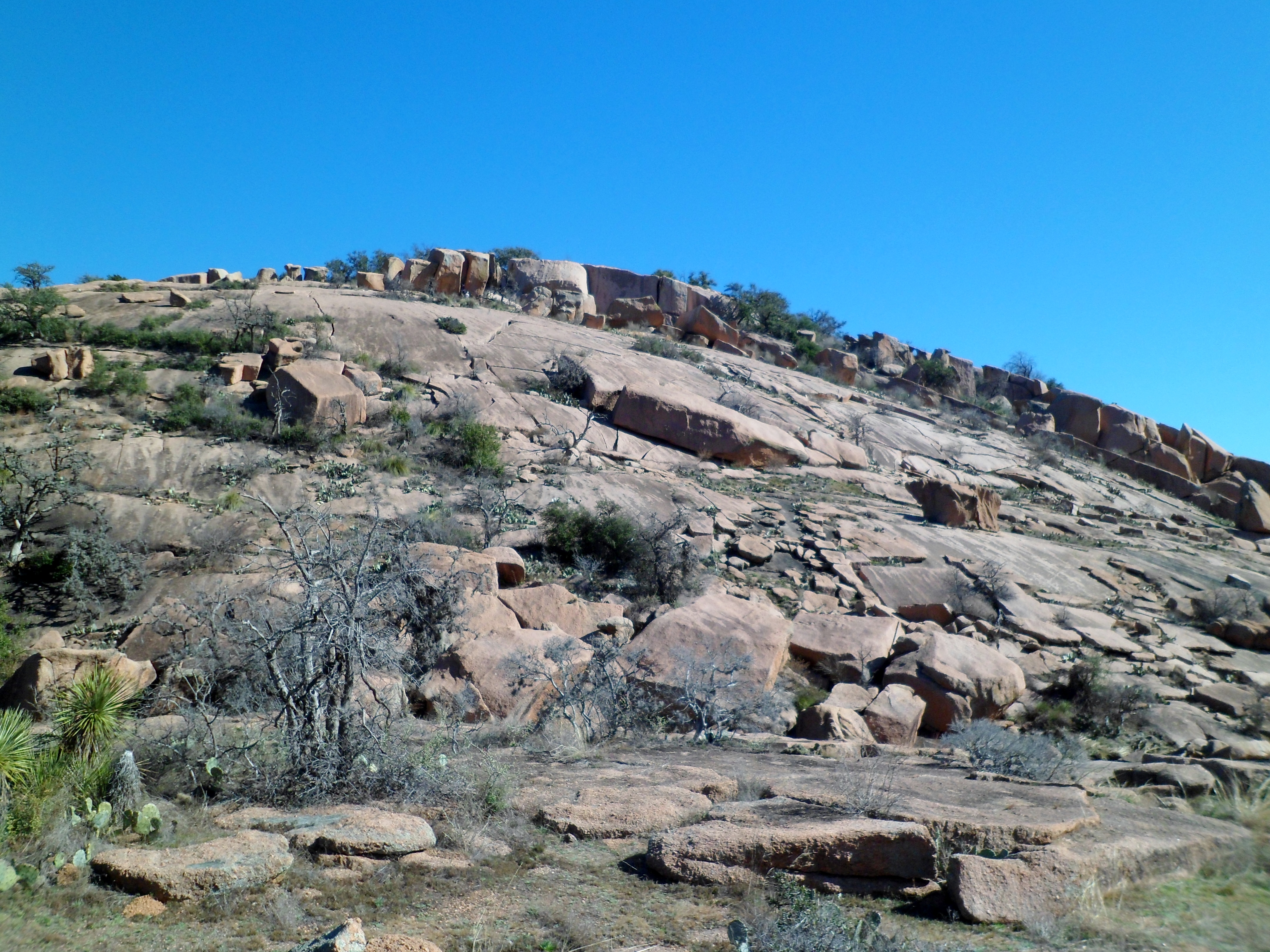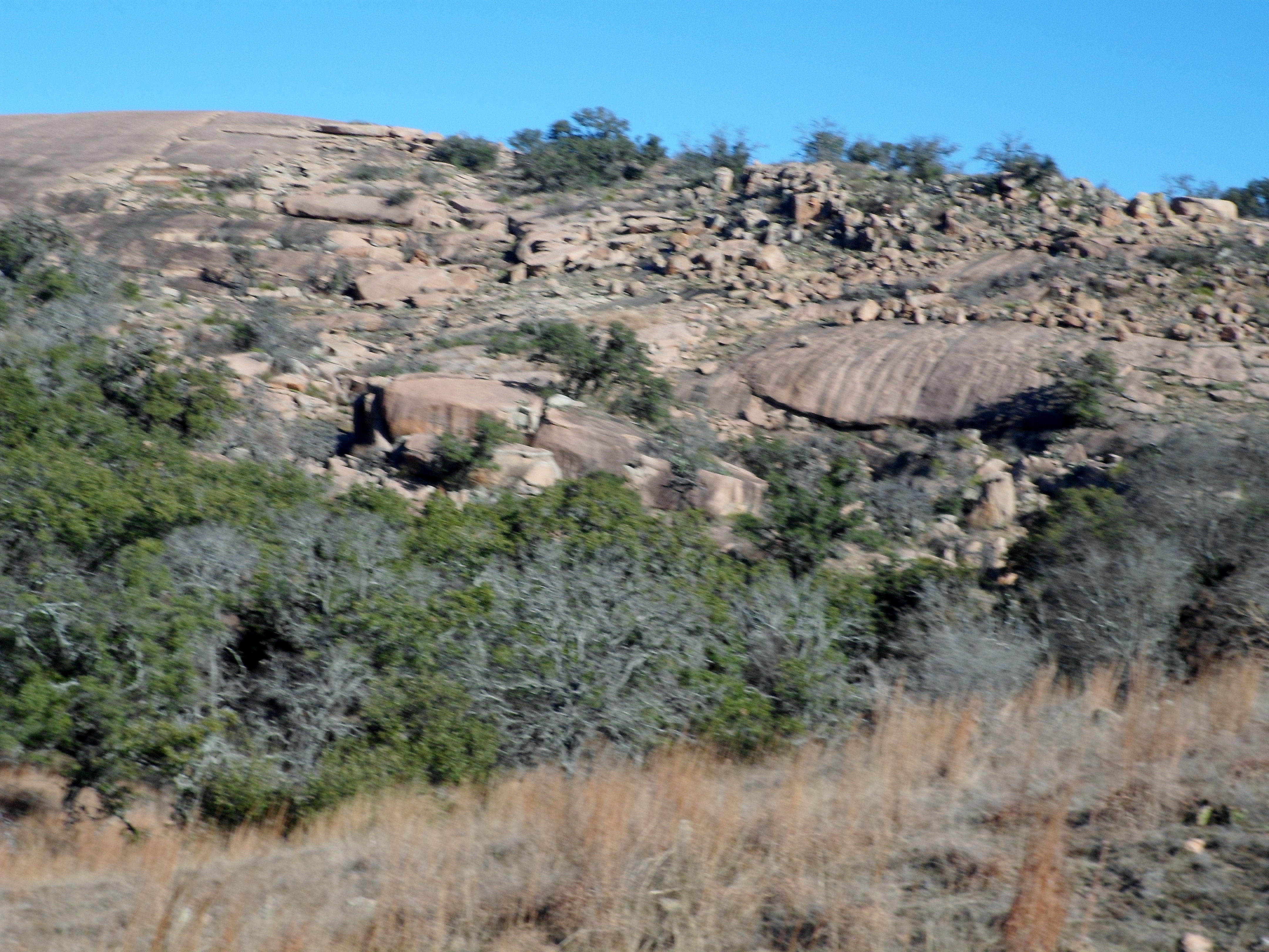 As we wound around Enchanted Rock, we got better and better views of the rock itself and the large granite slabs that clung to it. I wondered aloud what it would be like to witness one of these house-sized slabs come sliding down the side of the massive rock.