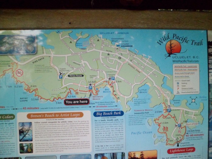 The next morning, I woke up early and went for a hike along part of the Wild Pacific Trail in Ucluelet. There had been wolf sightings along the trail in the past year, so there were signs warning about hiking with dogs. That was an interesting way to start the hike. Hike was about 3.7 miles.