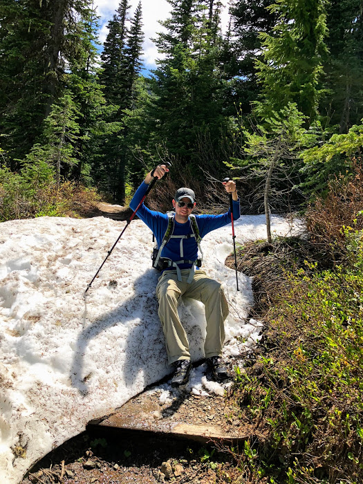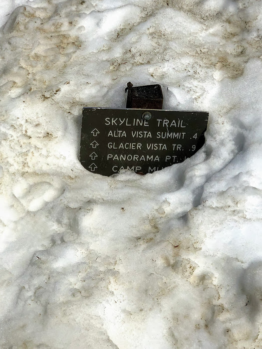 We reached the plaque at the top of what I think might actually be slightly below Panorama Point, but with the snow covered trail, this was good enough for us. It would be Panorama Point today. There was another marmot up top that was sprawled out and sunning on the snow.