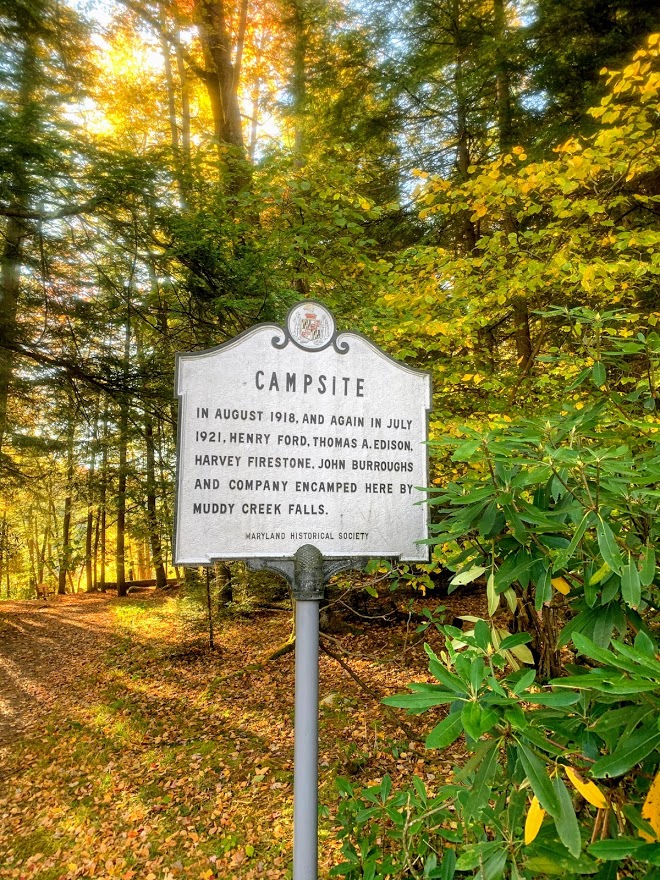 The biggest and best was Muddy Creek Falls. Near those falls was a marker commemorating a camping trip taken by Ford, Edison, Firestone, and Burroughs back in the 20s. I had just read about their camping antics in a book on the history of camping, so it was interesting to tramp the same grounds.