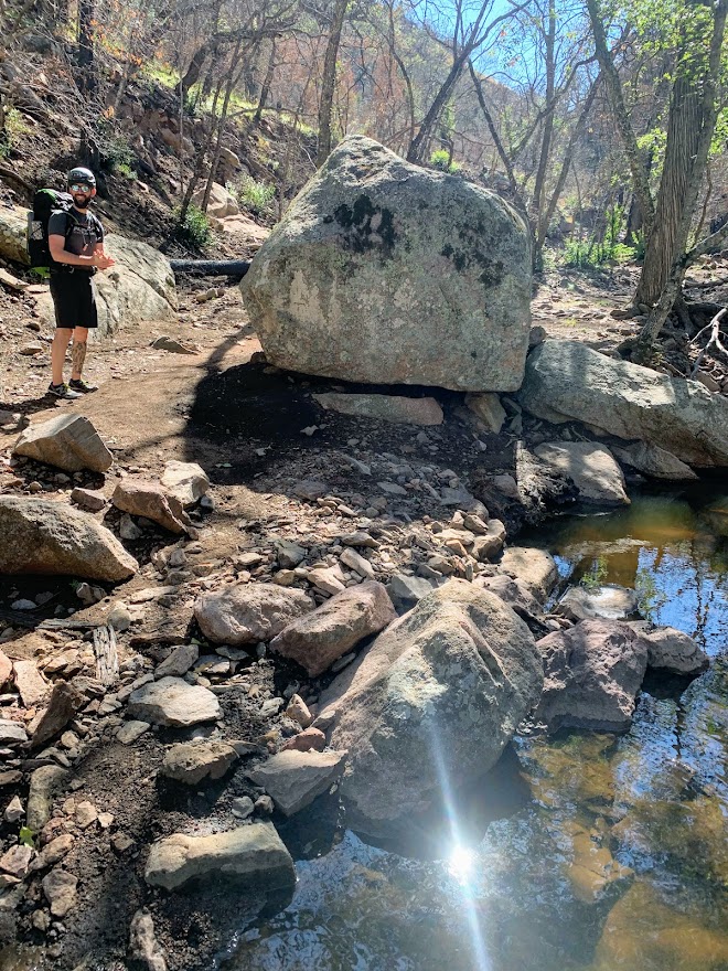 We made our way back down to the junction and had lunch in the shade. We still had a few miles to go to get to the East Rim, where we were camping for the night. Setting off into Boot Canyon, we came upon a lot of water, which would have been nice to know, since we were all carrying 5-6 liters each. That translates to 11-13 pounds, or about 1/3 of my total pack weight. It was a pretty canyon at least.