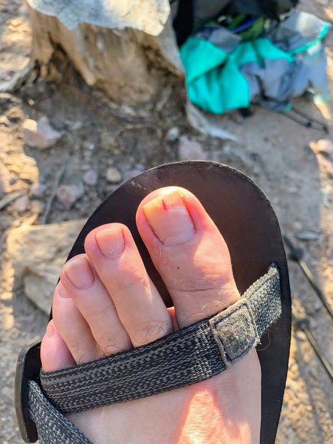 Finally we started to climb out of the canyon and up the last 500 feet of elevation to the East Rim. We were all extremely tired, but the views were amazing. We started to set up camp and I got into my camp shoes, after which I promptly stubbed my toe on a tiny stump sticking out of the ground near the bear box. It hurt like hell for a couple of minutes, but I got it wrapped up and it wasn’t that big of a deal, though I was dreading the hike down in the morning a bit.
