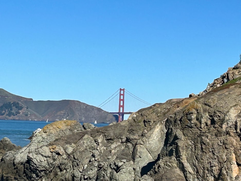As we continued down the crowded trail on this beautiful day, the views of the Golden Gate Bridge started to peek out from behind the rocks and became more and more pronounced as we moved along. The plant life was beautiful too and I got some good use out of my Seek app by iNaturalist, which makes it easy to identify plants using your phone camera.