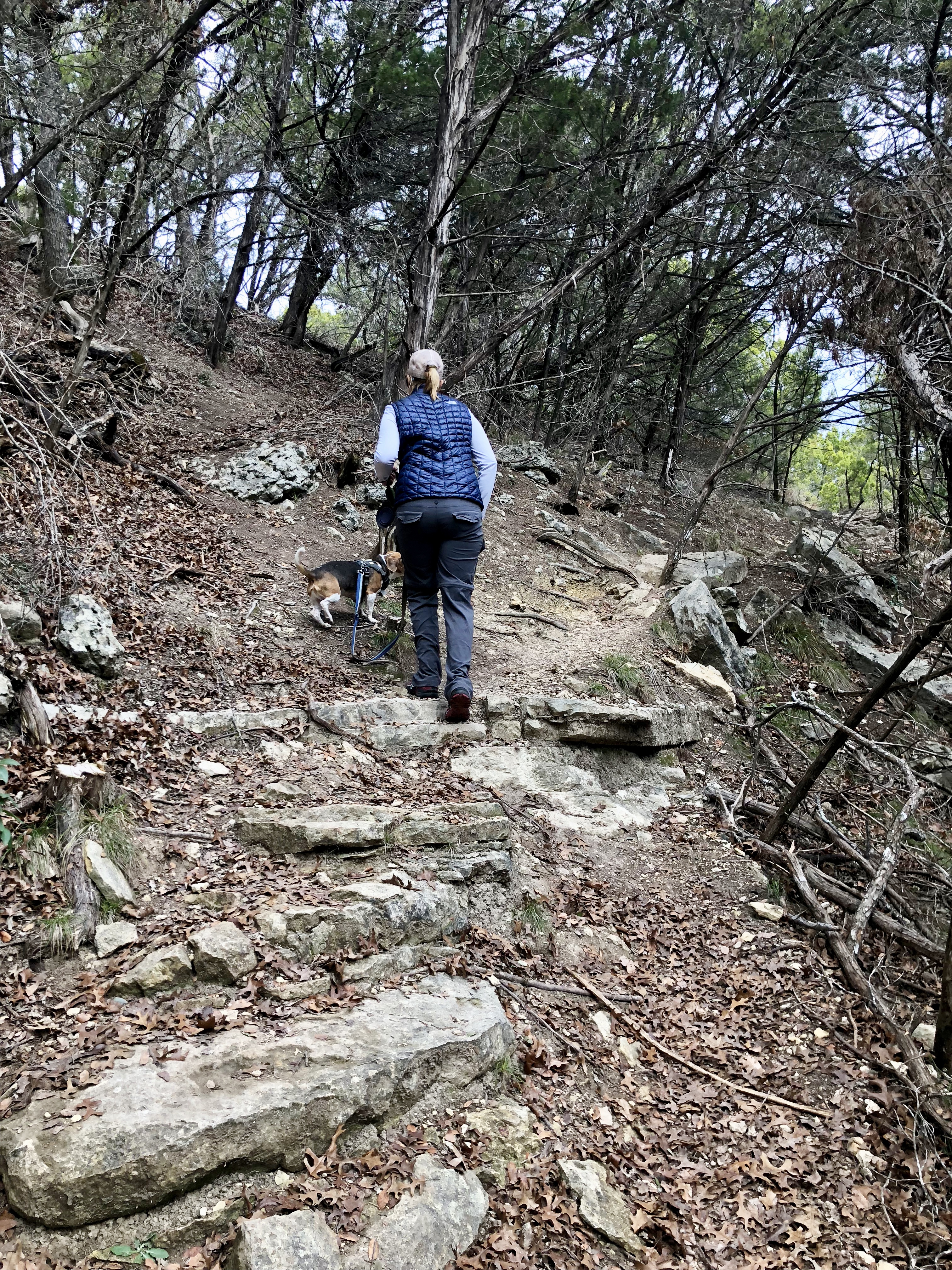 The trail started as your typical rocky Texas trail, but eventually gave way to more traditional tread and even soft dirt in some places along the ridge, which challenged our ankle strength. The dogs did great for the most part, though Biff pulled a fake injury at one point, causing me to carry him for a couple hundred yards until he miraculously recovered. What a goof.