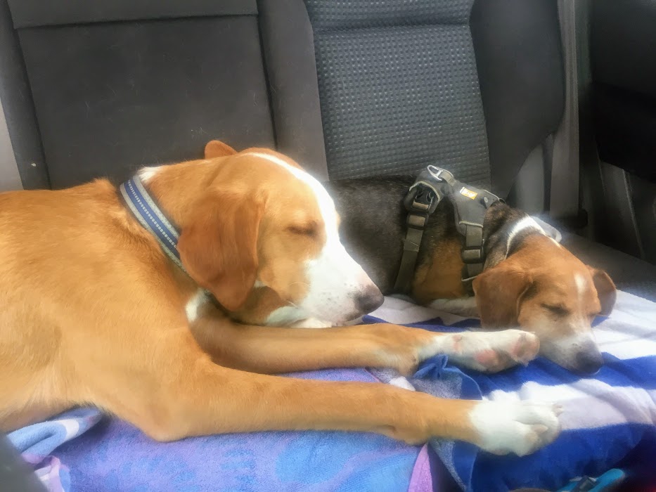 After a total of around 7 miles the pups were pooped and we drove back home. On the way back they got some good naps.